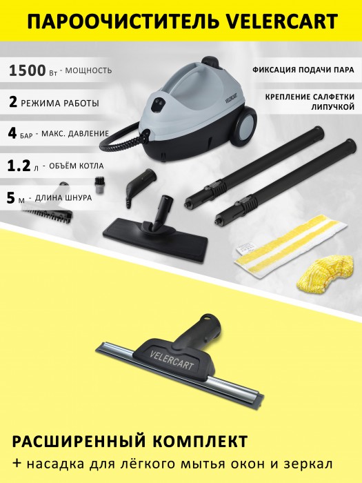 Легкий в управлении пароочиститель VELERCART V2 поможет вам в уборке всей квартиры! Это расширенный комплект с популярными аксессуарами. Аппарат оснащен 2-ступенчатым регулятором подачи пара, позволяющим выбирать режим, оптимальный для очистки разных поверхностей. А ещё курок подачи пара можно зафиксировать, чтобы не держать во время уборки!