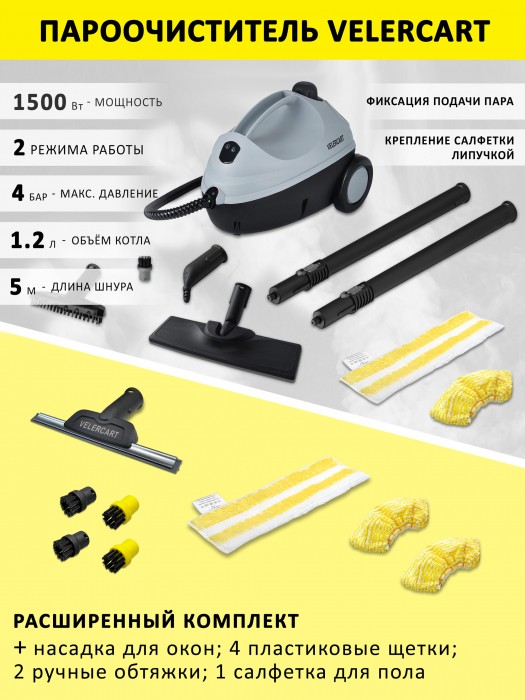 Пароочиститель VELERCART V2 + 1 салфетка для пола, 2 обтяжки для ручной насадки, 4 щёточки, насадка для мытья окон