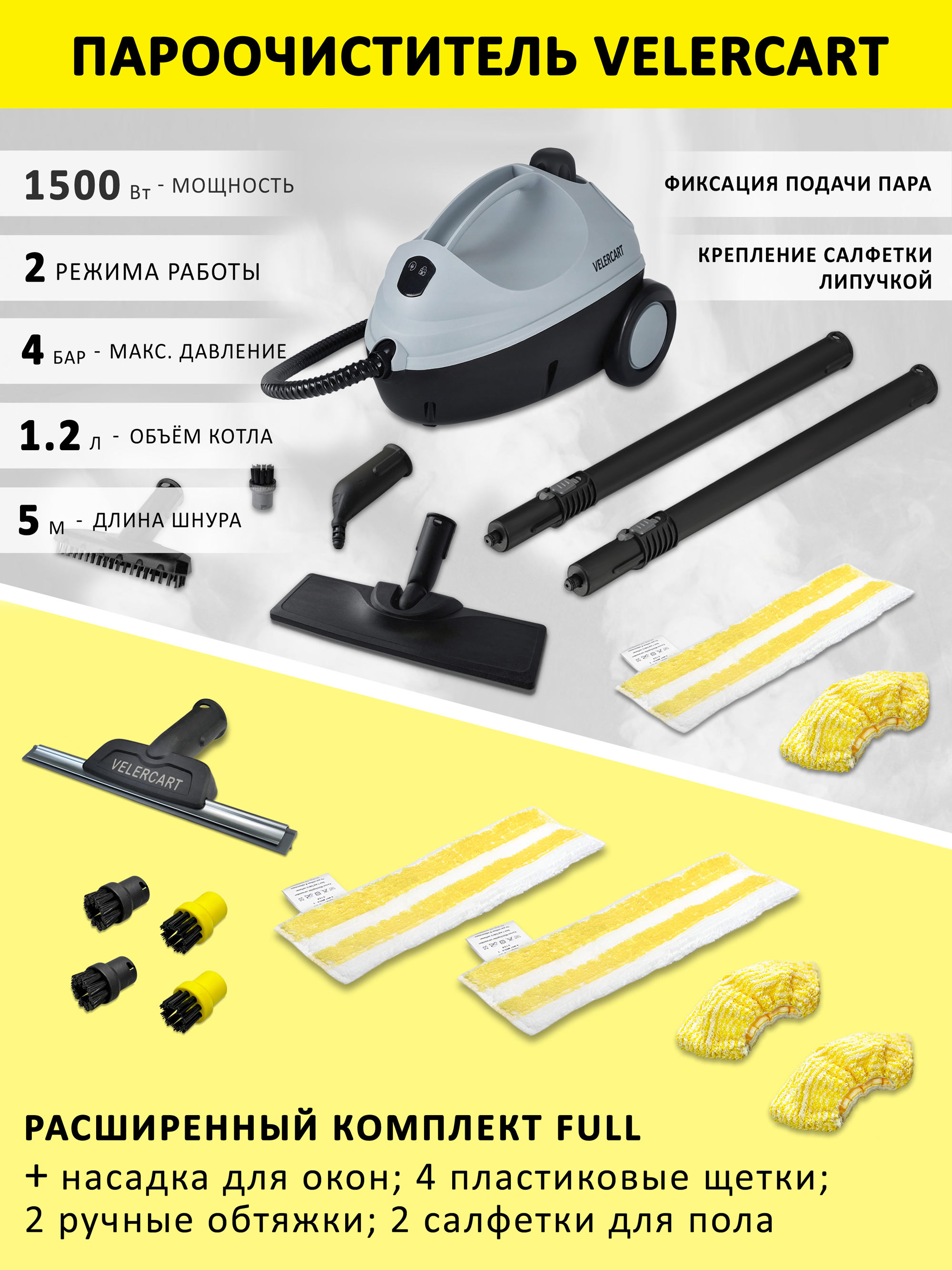 Пароочиститель VELERCART V2 + 2 салфетки для пола, 2 обтяжки для ручной насадки, 4 щёточки, насадка для мытья окон