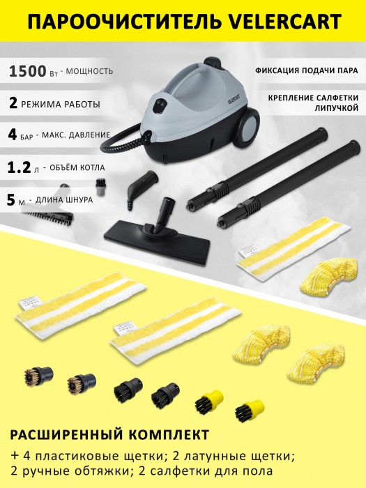 Пароочиститель VELERCART V2 + 2 салфетки для пола, 2 ручные обтяжки, 4 пластиковые щёточки и 2 латунные