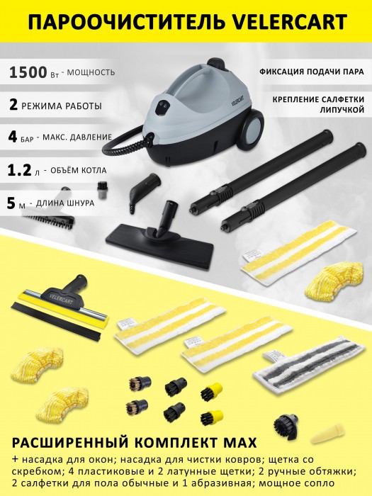 Легкий в управлении пароочиститель VELERCART V2 поможет вам в уборке всей квартиры! Это расширенный комплект MAX с популярными аксессуарами. Аппарат оснащен 2-ступенчатым регулятором подачи пара, позволяющим выбирать режим, оптимальный для очистки разных поверхностей. А ещё курок подачи пара можно зафиксировать, чтобы не держать во время уборки!