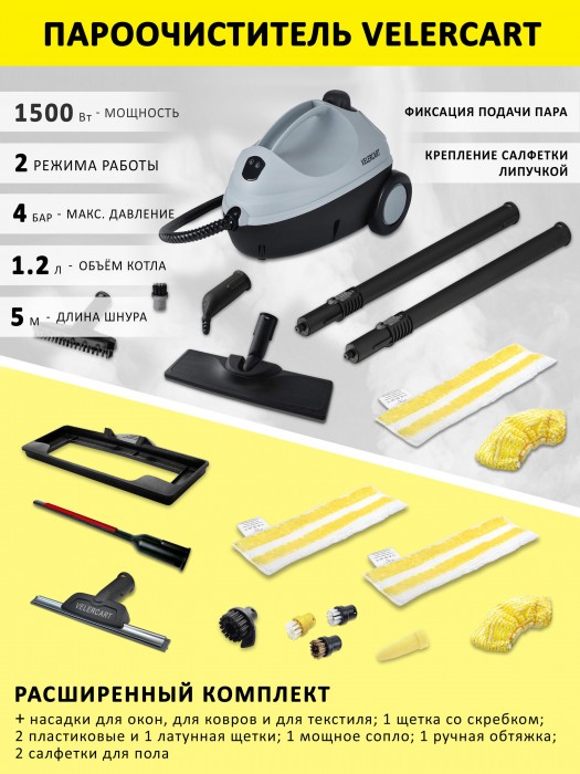 Легкий в управлении пароочиститель VELERCART V2 поможет вам в уборке всей квартиры! Это расширенный комплект с популярными аксессуарами. Аппарат оснащен 2-ступенчатым регулятором подачи пара, позволяющим выбирать режим, оптимальный для очистки разных поверхностей. А ещё курок подачи пара можно зафиксировать, чтобы не держать во время уборки!