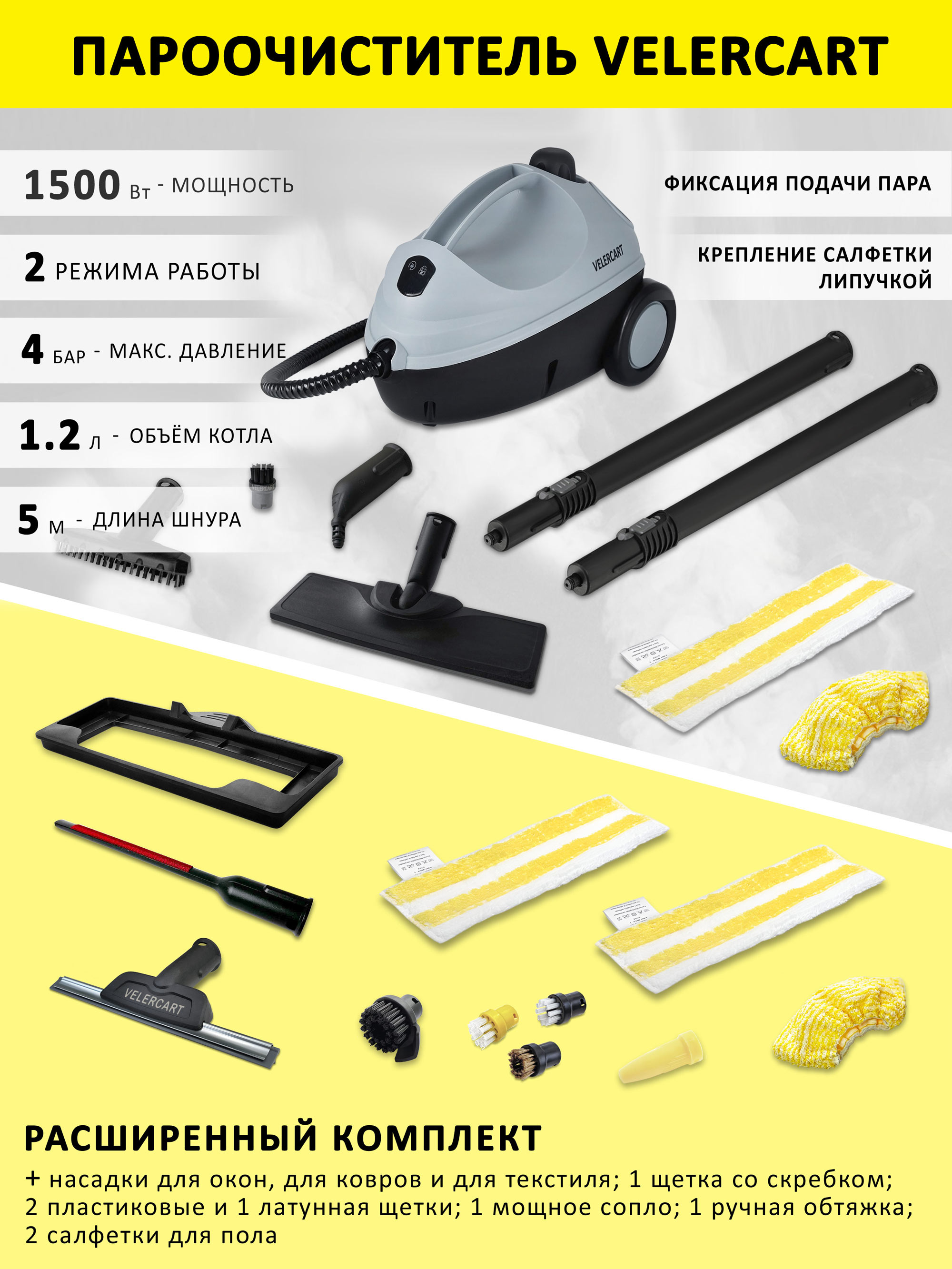 Пароочиститель VELERCART V2 + насадки для окон, текстиля и ковра, 2 салфетки для пола и 1 ручная, 2 пластиковые щётки и 1 латунная, 1 со скребком, 1 мощное сопло